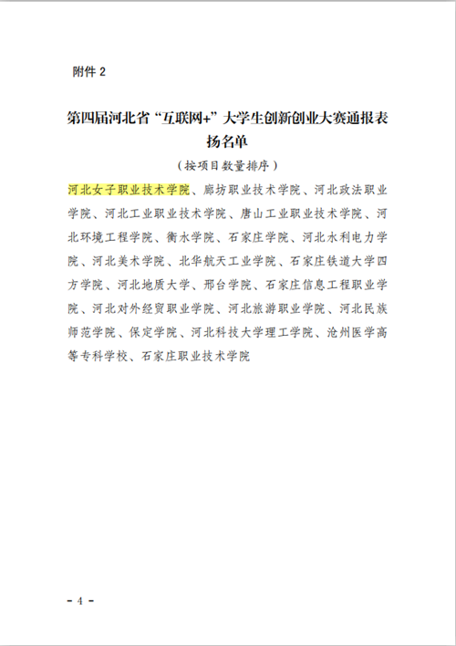 另从《河北省教育厅关于公布第四届河北省“互联网+” 大学生创新创业大赛优秀组织奖和通报表扬名单的通知》(冀教高函〔2018〕88 号)文件获悉,我院在第四届河北省“互联网+”大学生创新创业大赛中又喜获河北省教育厅通报表扬。